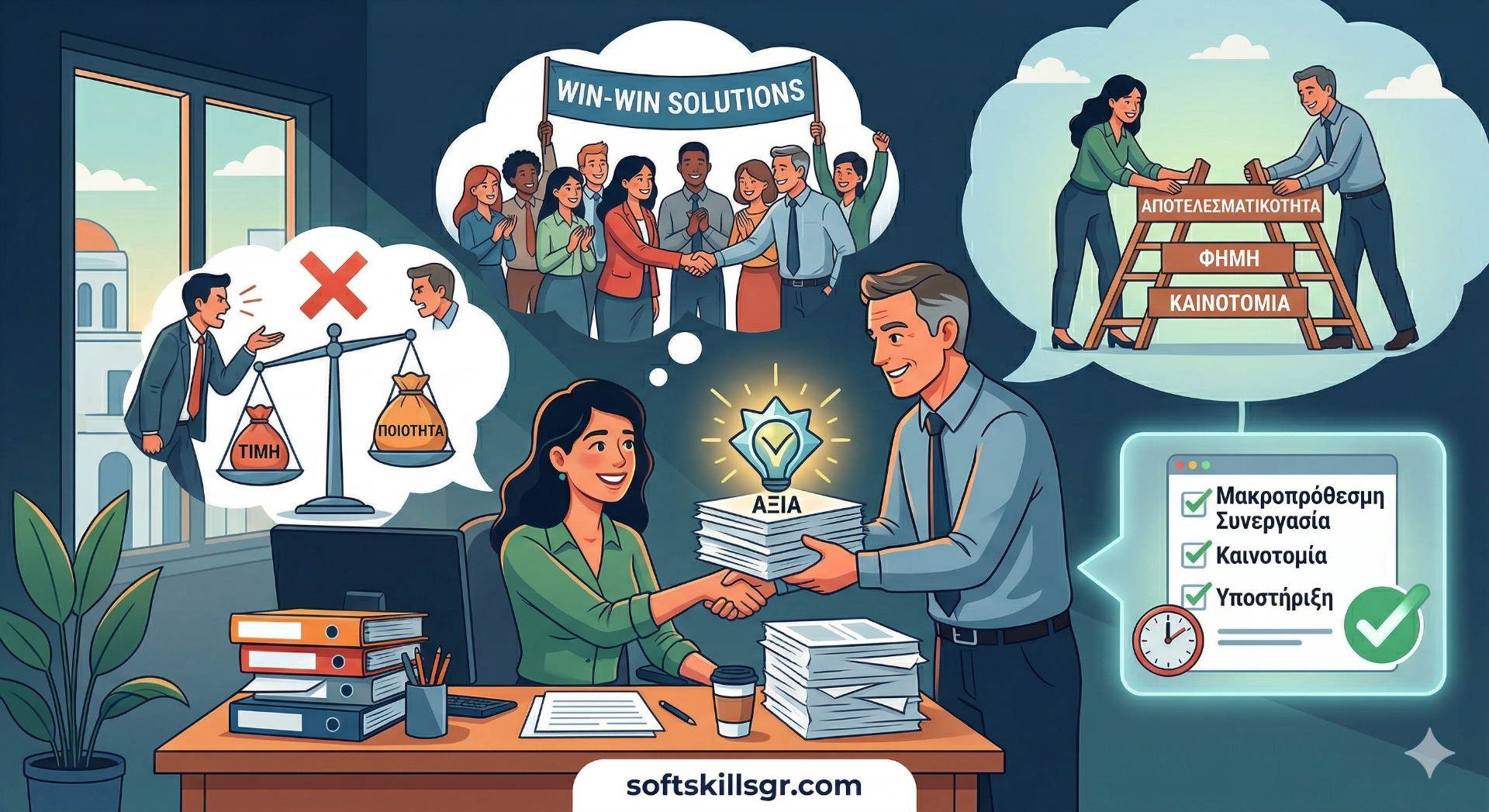 Στη διαπραγμάτευση B2B, κερδίζει αυτός που έχει προετοιμαστεί καλύτερα να αποδείξει τον αντίκτυπο της λύσης του στην επιχείρηση του άλλου. Τα soft skills της Διεκδικητικότητας (Assertiveness) και της Συναισθηματικής Νοημοσύνης σάς επιτρέπουν να κρατάτε τη στάση σας σταθερή, δείχνοντας ταυτόχρονα σεβασμό στον προϋπολογισμό του πελάτη. Μια Win-Win συμφωνία δεν είναι αυτή που είναι η φθηνότερη, αλλά αυτή που δημιουργεί τη μεγαλύτερη κοινή αξία.