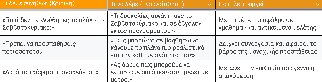 Η Δύναμη της Επιβεβαίωσης (Validation): «Είναι απόλυτα φυσιολογικό να θέλεις να φας παραπάνω στο οικογενειακό τραπέζι. Συμβαίνει σε όλους μας». Αυτή η φράση αφαιρεί το στίγμα και επιτρέπει στον πελάτη να εστιάσει στη λύση και όχι στην αυτομαστίγωση.