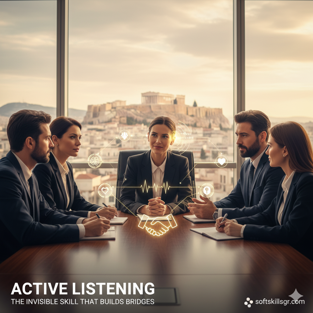Στον σύγχρονο, γρήγορο κόσμο των ελληνικών επιχειρήσεων, όλοι βιαζόμαστε να μιλήσουμε, να απαντήσουμε ή να προωθήσουμε την άποψή μας. Ωστόσο, η πιο ισχυρή επικοινωνιακή δεξιότητα δεν είναι η ομιλία, αλλά η Ακρόαση. Και όχι η παθητική ακρόαση—η Ενεργητική Ακρόαση (Active Listening). Αυτή είναι η ικανότητα να συγκεντρώνεσαι πλήρως σε αυτό που λέει ο άλλος, να κατανοείς όχι μόνο τα λόγια, αλλά και τα μη λεκτικά μηνύματα και τα συναισθήματα. Στην Ελλάδα, όπου οι σχέσεις εμπιστοσύνης χτίζονται προσωπικά, η Ενεργητική Ακρόαση δείχνει σεβασμό, εμπλοκή και επαγγελματισμό. Είναι η «αόρατη» δύναμη που λύνει παρεξηγήσεις, μειώνει τις συγκρούσεις και απογειώνει τη συνεργασία της ομάδας σου.