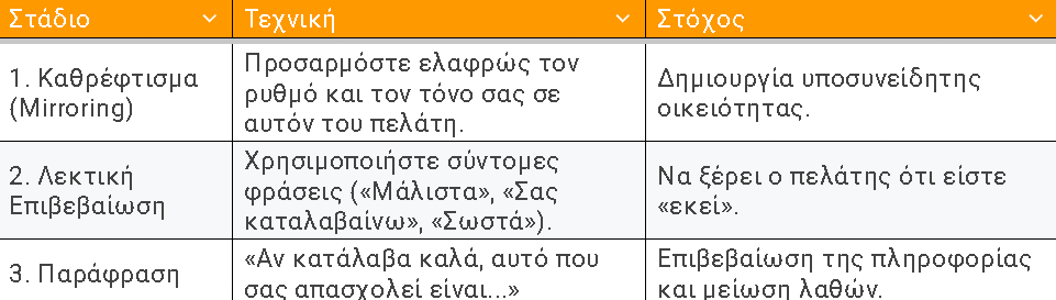Στην επικοινωνία πρόσωπο με πρόσωπο, το 55% του μηνύματος μεταφέρεται από τη γλώσσα του σώματος. Στο τηλεφωνικό κέντρο, αυτό το 55% εξαφανίζεται. Όλο το βάρος πέφτει στον τόνο της φωνής και στην ποιότητα της ακρόασης. Το soft skill της Λεκτικής Πειθούς δεν αφορά το να μιλάτε πολύ, αλλά το να μιλάτε σωστά, κάνοντας τον πελάτη να νιώθει ότι τον καταλαβαίνετε, παρόλο που δεν σας βλέπει.