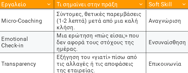 Μετατρέψτε το Feedback σε Διάλογο: Αντί να λέτε «πρέπει να μειώσεις τον χρόνο σου», ρωτήστε: «Τι σε δυσκολεύει περισσότερο στο κλείσιμο της κλήσης και πώς μπορώ να σε βοηθήσω να το κάνεις πιο γρήγορα;».